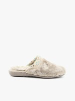 Chinelos de casa com pelo e acabamento em malha com padrão. Têm biqueira redonda e sola em borracha.Envíos
