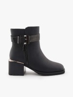 Botins mulher de salto alto. Tem fecho de correr, biqueira redonda, detalhe metálico no calcanhar e fivela.Envíos