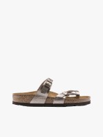 Sandálias mulher slip-on, com efeito metalizado e fivelas na frente. Têm bqiueira redonda e sola de borracha.Envíos