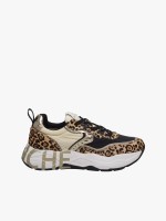 - Parte superior em pele de camurça e tecido com painéis de padrão animal e detalhes metalizados