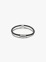 Pulseira composta por dois fios um de pele genuína em preto e outra em aço inoxidável. Os dois fios estão unidos em pontos opostos da pulseira por dois ímans em metal prateado criando a ilusão de ser apenas uma pulseira dupla mas, no entanto, podem ser usados de forma isolada.Envíos