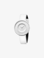 Relógio analógico mulher com diâmetro de 38 mm. Tem padrão da marca no mostrador e bracelete em pele.