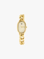 Relógio analógico feminino dourado com mostrador oval e pulseira de elos.Envíos