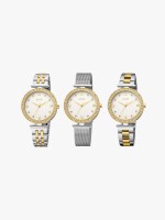 A Box One Desire contém: Mostrador branco com três ponteiros dourados (horas, minutos e segundos) e índices com quatro números romanos em dourado e cristais brancos cravados a marcar as restantes horas.