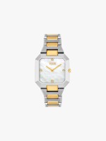 - Bracelete em aço inoxidável de dois tons com fecho de borboleta acionado por botões