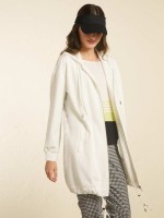 Casaco mulher comprido em algodão, com capuz adornado cordão. Tem fecho de correr, dois bolsos embutidos e cordão no acabamento.Envíos