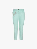Calça de Ganga de cintura média. Tem uma leve corrente de metal dourado pendurada na cintura, juntamente com encantos coloridos.Cuidado de lavado