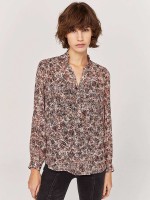 Blusa mulher com padrão estampado e decote entalhado. Tem botões, manga curta e punhos abotoados.Cuidado de lavado