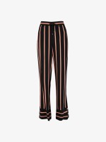 Calças fluidas às riscas. Tem cordão para ajuste de cintura e dois bolsos em fecho de correr.Cuidado de lavado