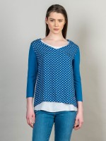 Camisola mulher com sobreposição de tecido e padrão às bolinhas estampado. Tem decote em V e manga comprida.Cuidado de lavado
