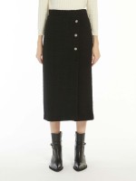 Saia mulher midi straight fit em lã. Tem botões de metal, fecho de correr oculto na lateral e fenda frontal assimétrica.Envíos