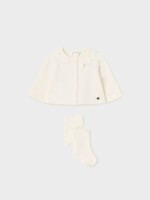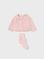 Bolero menina em algodão. Tem decote redondo adornado por folhos, manga comprida e botões. Tem collants básicas.Cuidado de lavado