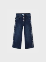 Calças cropped com fecho em botões. Tem cinco bolsos e laterais adornadas por apliques.Cuidado de lavado