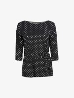 Blusa para mulher, de decote redondo. Tem padrão bicolor e faixa de laçada na cinta. Feito em Portugal.Cuidado de lavado