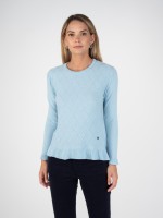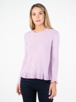Camisola de malha com padrão texturado. Tem decote redondo, manga comprida e acabamentos canelados com folhos.Devoluciones