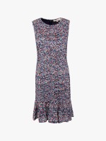 Vestido de corte justo, mangas caveadas e decote redondo. Tem efeito drapeado e padrão floral.Cuidado de lavado