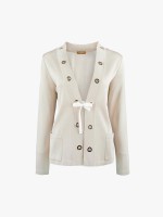 Casaco de malha com dois bolsos laterais. Aros dourados no rebordo. Aperta com laçada..Cuidado de lavado