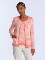 Conjunto de malha mulher com padrão estampado. Casaco abotoado com decote redondo. T-shirt de decote redondo e manga curta. Acabamentos canelados em cor contrastante.Cuidado de lavado