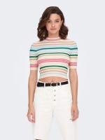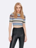T-shirt mulher cropped fit às riscas. Tem decote redondo e manga curta.Devoluciones