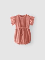 Fofo menina em algodão. Tem decote redondo, manga com folhos, botões no ombro e cintura ajustável por cordão.Cuidado de lavado
