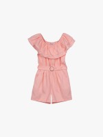 Macacão curto para menina. Tem cinto de fivela e detalhes com folhos.Envíos