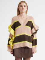 Camisola de malha com padrão. Tem decote em V, manga comprida adornada por folhos e acabamentos canelados.Devoluciones