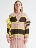 Casaco de malha com padrão. Tem decote em V, manga comprida adornada por folhos e botões.Envíos